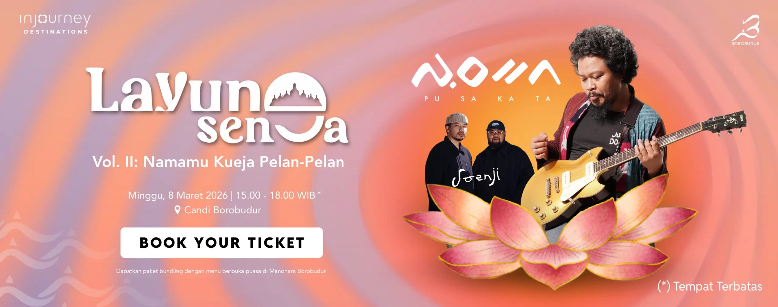 Borobudur Sunset entrance ticket to see the sunset at Borobudur. Includes dinner and a souvenir. Limited